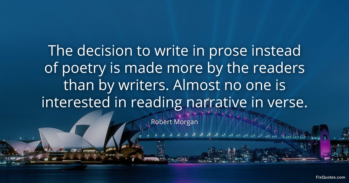 Morgan, Robert. (2026, January 17). The decision to write in prose instead of poetry is made more by the readers than by writers. Almost no one is interested in reading narrative in verse. FixQuotes. https://fixquotes.com/quotes/the-decision-to-write-in-prose-instead-of-poetry-76474/