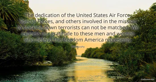 Murphy, Tim. "The dedication of the United States Air Force, Special Forces, and others involved in the mission to tracking down terrorists can not be matched. We express our gratitude to these men and women who defend the freedom America represents." FixQuotes. January 16, 2026. https://fixquotes.com/quotes/the-dedication-of-the-united-states-air-force-98202/.