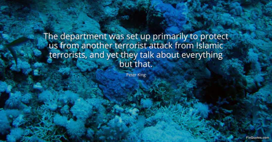 King, Peter. "The department was set up primarily to protect us from another terrorist attack from Islamic terrorists, and yet they talk about everything but that." FixQuotes. January 15, 2026. https://fixquotes.com/quotes/the-department-was-set-up-primarily-to-protect-us-144851/.