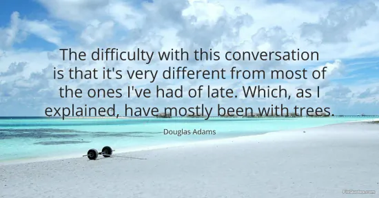 Adams, Douglas. "The difficulty with this conversation is that it's very different from most of the ones I've had of late. Which, as I explained, have mostly been with trees." FixQuotes. January 15, 2026. https://fixquotes.com/quotes/the-difficulty-with-this-conversation-is-that-its-6425/.