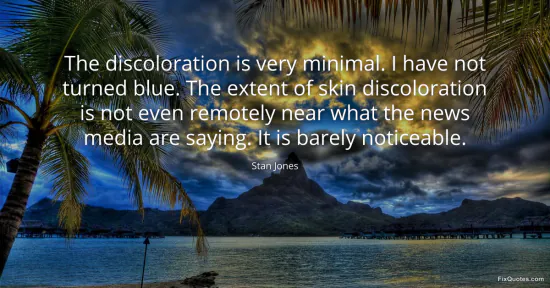 Jones, Stan. "The discoloration is very minimal. I have not turned blue. The extent of skin discoloration is not even remotely near what the news media are saying. It is barely noticeable." FixQuotes. January 15, 2026. https://fixquotes.com/quotes/the-discoloration-is-very-minimal-i-have-not-170421/.