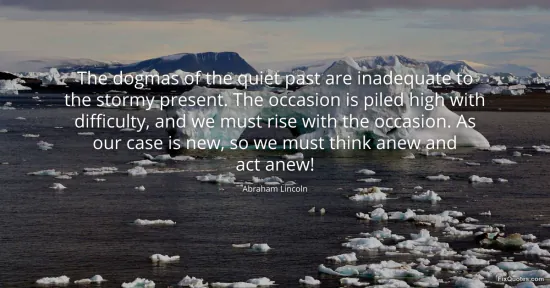 "The dogmas of the quiet past are inadequate to the stormy present. The occasion is piled high with difficulty, and we must rise with the occasion. As our case is new, so we must think anew and act anew!" FixQuotes, 19 Feb. 2026, https://fixquotes.com/quotes/the-dogmas-of-the-quiet-past-are-inadequate-to-32596/. Accessed 9 Mar. 2026.