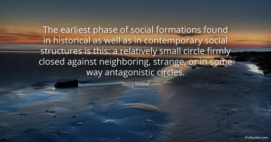 "The earliest phase of social formations found in historical as well as in contemporary social structures is this: a relatively small circle firmly closed against neighboring, strange, or in some way antagonistic circles." FixQuotes, 15 Jan. 2026, https://fixquotes.com/quotes/the-earliest-phase-of-social-formations-found-in-148242/. Accessed 12 Feb. 2026.