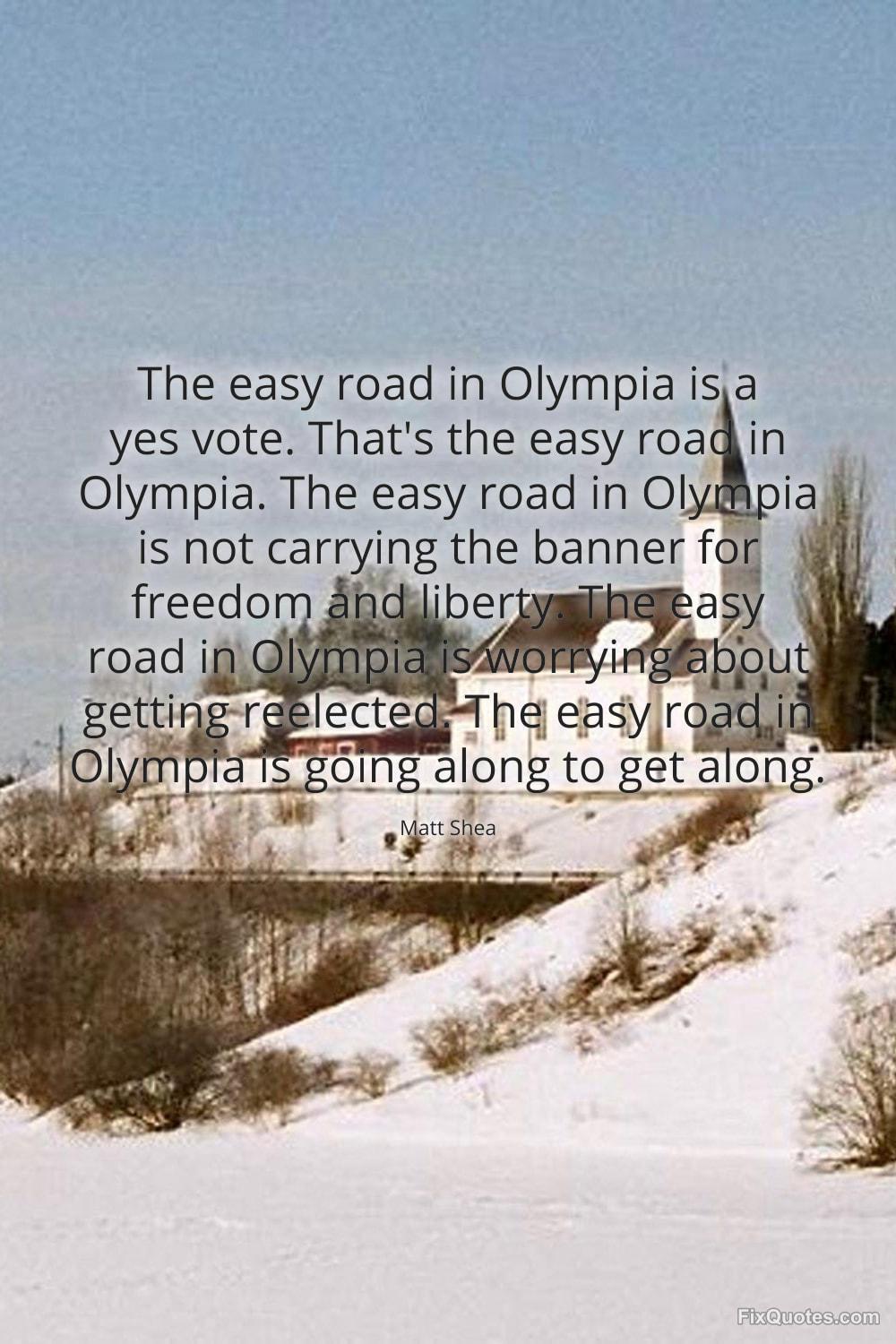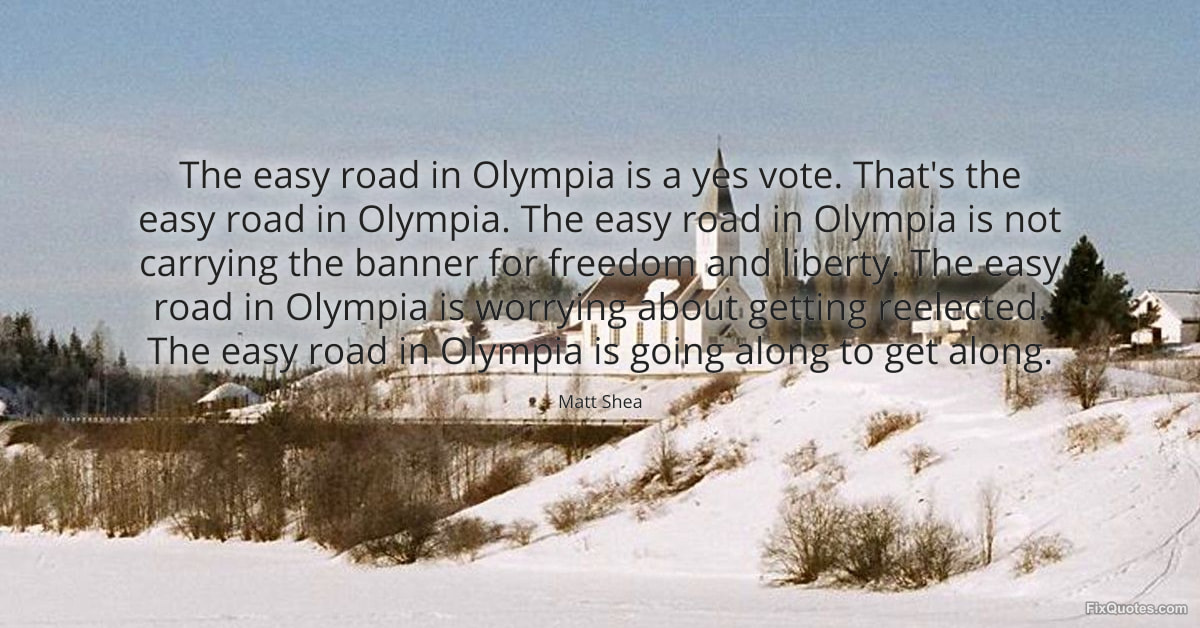 Shea, Matt. (2026, February 9). The easy road in Olympia is a yes vote. That's the easy road in Olympia. The easy road in Olympia is not carrying the banner for freedom and liberty. The easy road in Olympia is worrying about getting reelected. The easy road in Olympia is going along to get along. FixQuotes. https://fixquotes.com/quotes/the-easy-road-in-olympia-is-a-yes-vote-thats-the-185024/