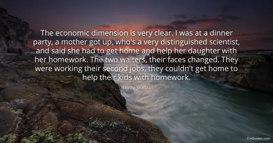Shalala, Donna. (2026, January 17). The economic dimension is very clear. I was at a dinner party, a mother got up, who's a very distinguished scientist, and said she had to get home and help her daughter with her homework. The two waiters, their faces changed. They were working their second jobs, they couldn't get home to help their kids with homework. FixQuotes. https://fixquotes.com/quotes/the-economic-dimension-is-very-clear-i-was-at-a-52604/