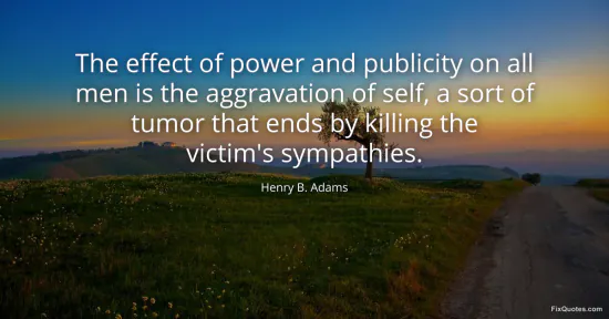 Adams, Henry B. "The effect of power and publicity on all men is the aggravation of self, a sort of tumor that ends by killing the victim's sympathies." FixQuotes. January 15, 2026. https://fixquotes.com/quotes/the-effect-of-power-and-publicity-on-all-men-is-144018/.