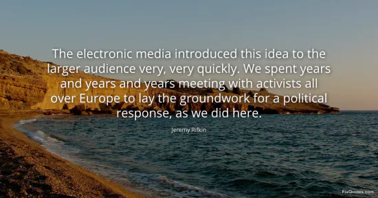 Rifkin, Jeremy. "The electronic media introduced this idea to the larger audience very, very quickly. We spent years and years and years meeting with activists all over Europe to lay the groundwork for a political response, as we did here." FixQuotes. January 18, 2026. https://fixquotes.com/quotes/the-electronic-media-introduced-this-idea-to-the-22656/.