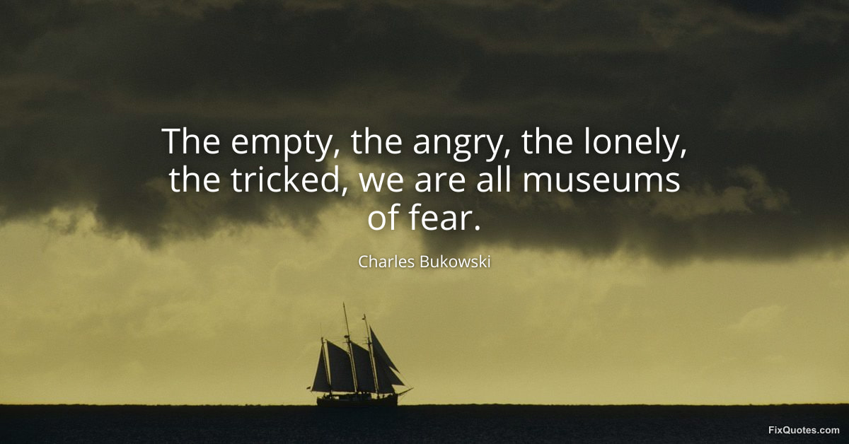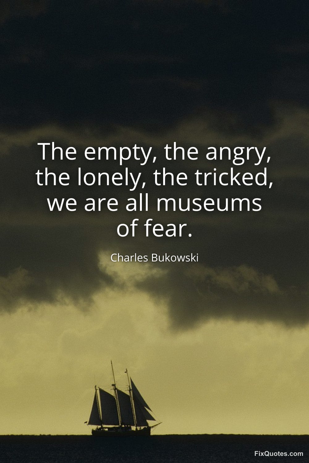 Bukowski, Charles. "The empty, the angry, the lonely, the tricked, we are all museums of fear." FixQuotes. February 10, 2026. https://fixquotes.com/quotes/the-empty-the-angry-the-lonely-the-tricked-we-are-185237/.