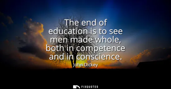 A good education, John Dickey implies, should produce someone you can trust with power. Not merely a person who can do the job, but one who knows when not to. The line’s quiet force comes from its pairing of two ideals that institutions love to separate: competence (the measurable, resume-friendly stuff) and conscience (the slippery internal governor that can’t be audited). By framing the “end of education” as making “men made whole,” Dickey treats schooling less as a ladder and more as a moral workshop - an argument aimed at a political class that often celebrates expertise while outsourcing ethics to private faith or personal character.