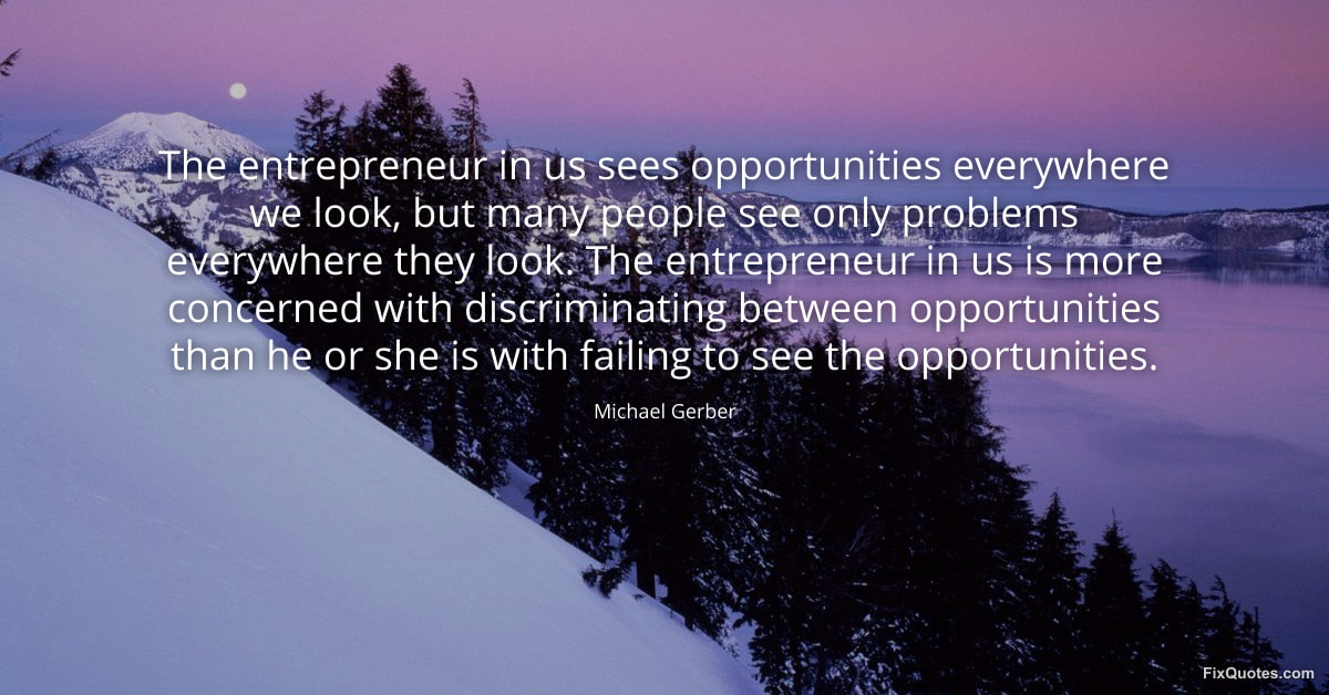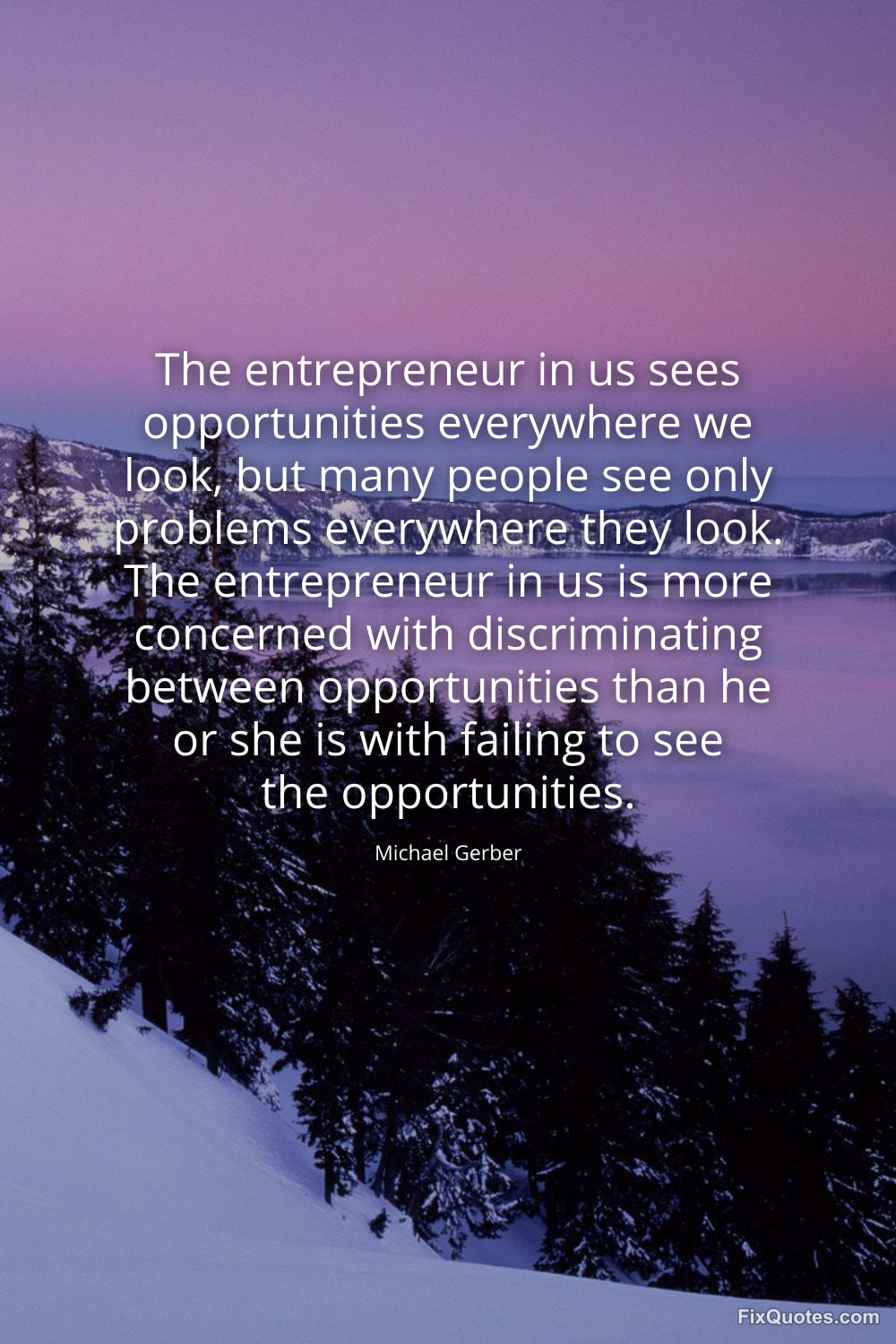 Gerber, Michael. (2026, February 5). The entrepreneur in us sees opportunities everywhere we look, but many people see only problems everywhere they look. The entrepreneur in us is more concerned with discriminating between opportunities than he or she is with failing to see the opportunities. FixQuotes. https://fixquotes.com/quotes/the-entrepreneur-in-us-sees-opportunities-184942/