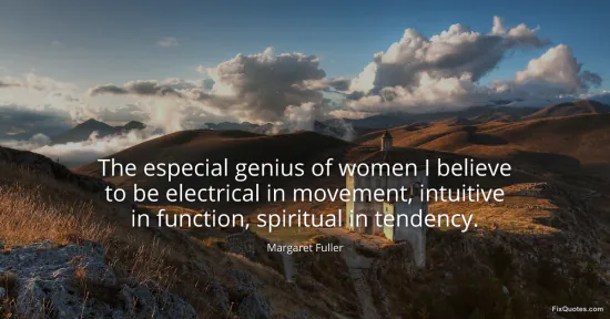 Fuller, Margaret. "The especial genius of women I believe to be electrical in movement, intuitive in function, spiritual in tendency." FixQuotes. January 16, 2026. https://fixquotes.com/quotes/the-especial-genius-of-women-i-believe-to-be-89203/.