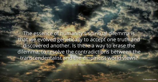 Wilson, E. O. (2026, January 15). The essence of humanity's spiritual dilemma is that we evolved genetically to accept one truth and discovered another. Is there a way to erase the dilemma, to resolve the contradictions between the transcendentalist and the empiricist world views? FixQuotes. https://fixquotes.com/quotes/the-essence-of-humanitys-spiritual-dilemma-is-5360/