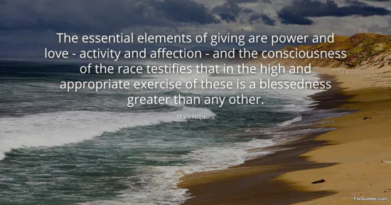Hopkins, Mark. (2026, January 16). The essential elements of giving are power and love - activity and affection - and the consciousness of the race testifies that in the high and appropriate exercise of these is a blessedness greater than any other. FixQuotes. https://fixquotes.com/quotes/the-essential-elements-of-giving-are-power-and-132399/