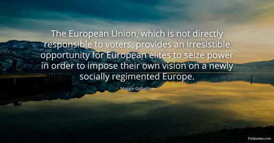Gallagher, Maggie. "The European Union, which is not directly responsible to voters, provides an irresistible opportunity for European elites to seize power in order to impose their own vision on a newly socially regimented Europe." FixQuotes. January 16, 2026. https://fixquotes.com/quotes/the-european-union-which-is-not-directly-87467/.
