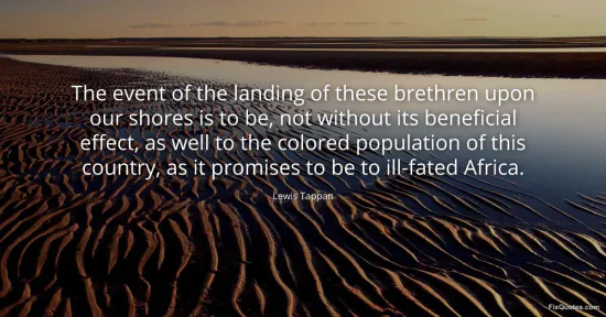 Tappan, Lewis. "The event of the landing of these brethren upon our shores is to be, not without its beneficial effect, as well to the colored population of this country, as it promises to be to ill-fated Africa." FixQuotes. January 16, 2026. https://fixquotes.com/quotes/the-event-of-the-landing-of-these-brethren-upon-112922/.