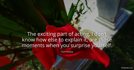 Cruise, Tom. "The exciting part of acting, I don't know how else to explain it, are those moments when you surprise yourself." FixQuotes. January 16, 2026. https://fixquotes.com/quotes/the-exciting-part-of-acting-i-dont-know-how-else-113915/.