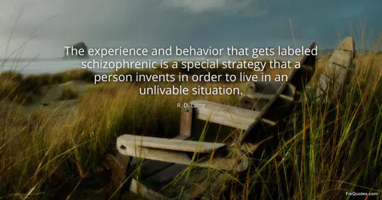 "The experience and behavior that gets labeled schizophrenic is a special strategy that a person invents in order to live in an unlivable situation." FixQuotes, 16 Jan. 2026, https://fixquotes.com/quotes/the-experience-and-behavior-that-gets-labeled-135270/. Accessed 12 Feb. 2026.