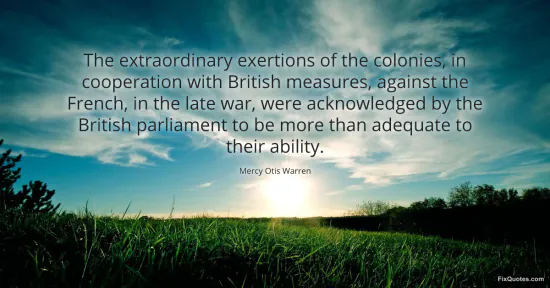 Warren, Mercy Otis. "The extraordinary exertions of the colonies, in cooperation with British measures, against the French, in the late war, were acknowledged by the British parliament to be more than adequate to their ability." FixQuotes. January 18, 2026. https://fixquotes.com/quotes/the-extraordinary-exertions-of-the-colonies-in-6800/.