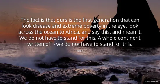 Bono. (2026, January 16). The fact is that ours is the first generation that can look disease and extreme poverty in the eye, look across the ocean to Africa, and say this, and mean it. We do not have to stand for this. A whole continent written off - we do not have to stand for this. FixQuotes. https://fixquotes.com/quotes/the-fact-is-that-ours-is-the-first-generation-98493/