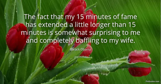 Obama, Barack. "The fact that my 15 minutes of fame has extended a little longer than 15 minutes is somewhat surprising to me and completely baffling to my wife." FixQuotes. January 17, 2026. https://fixquotes.com/quotes/the-fact-that-my-15-minutes-of-fame-has-extended-34428/.