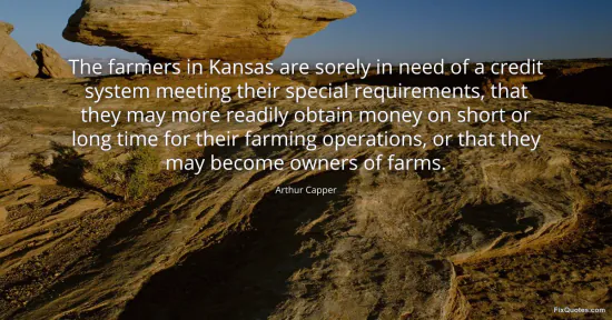 Capper, Arthur. "The farmers in Kansas are sorely in need of a credit system meeting their special requirements, that they may more readily obtain money on short or long time for their farming operations, or that they may become owners of farms." FixQuotes. January 17, 2026. https://fixquotes.com/quotes/the-farmers-in-kansas-are-sorely-in-need-of-a-37616/.