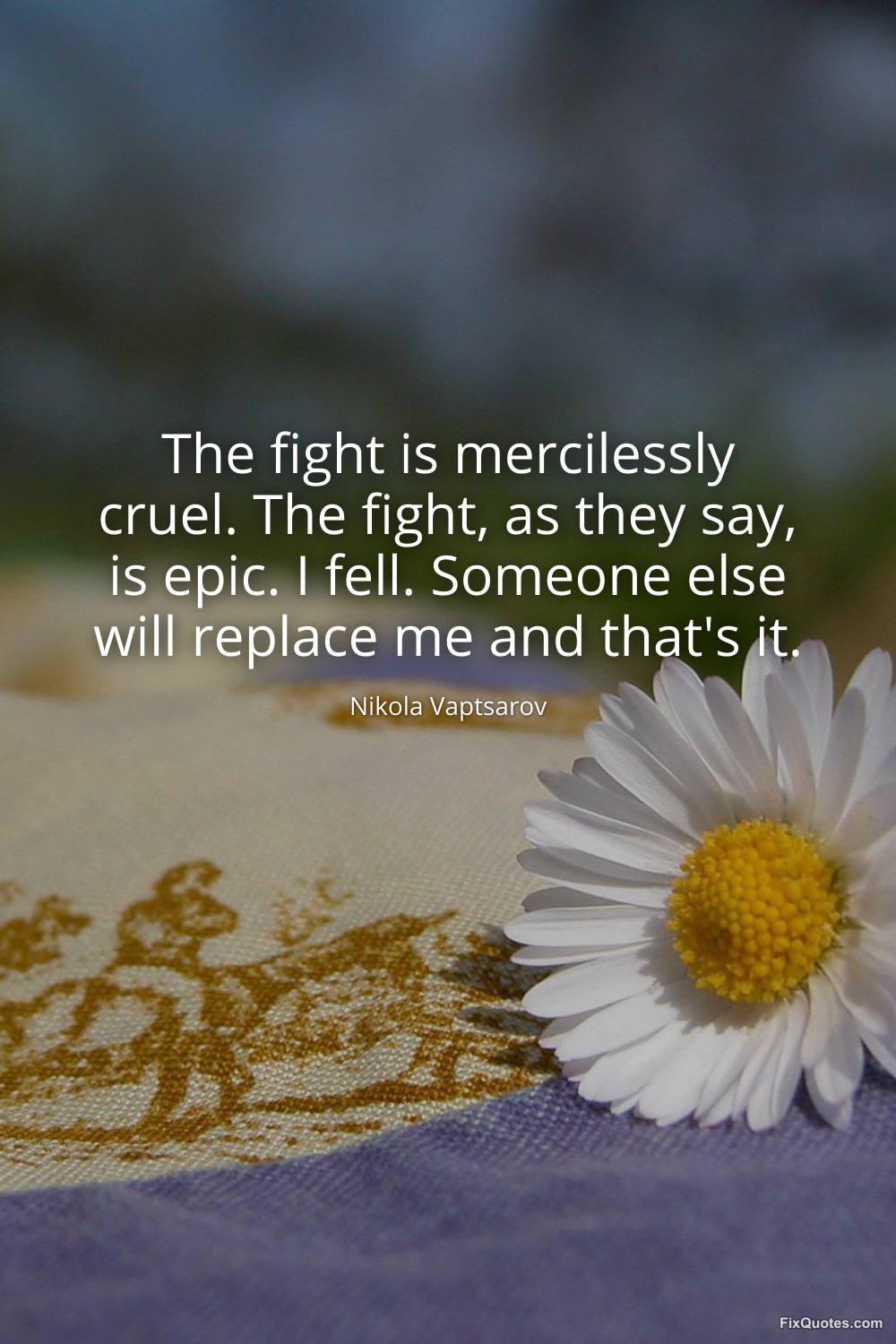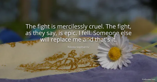 Vaptsarov, Nikola. (2026, March 12). The fight is mercilessly cruel. The fight, as they say, is epic. I fell. Someone else will replace me and that's it. FixQuotes. https://fixquotes.com/quotes/the-fight-is-mercilessly-cruel-the-fight-as-they-186055/