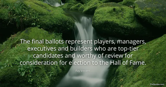 Vincent, Fay. "The final ballots represent players, managers, executives and builders who are top-tier candidates and worthy of review for consideration for election to the Hall of Fame." FixQuotes. January 16, 2026. https://fixquotes.com/quotes/the-final-ballots-represent-players-managers-91248/.