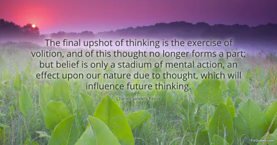 Peirce, Charles Sanders. "The final upshot of thinking is the exercise of volition, and of this thought no longer forms a part; but belief is only a stadium of mental action, an effect upon our nature due to thought, which will influence future thinking." FixQuotes. January 17, 2026. https://fixquotes.com/quotes/the-final-upshot-of-thinking-is-the-exercise-of-49815/.