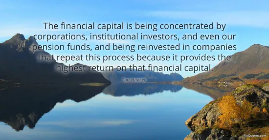 Hawken, Paul. "The financial capital is being concentrated by corporations, institutional investors, and even our pension funds, and being reinvested in companies that repeat this process because it provides the highest return on that financial capital." FixQuotes. January 16, 2026. https://fixquotes.com/quotes/the-financial-capital-is-being-concentrated-by-83073/.