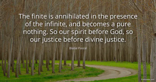 | Source | Blaise Pascal, Pensées (posthumous collection, 1670). Original French fragment often rendered: "Le fini s'anéantit devant l'infini et devient un pur néant. Ainsi notre esprit devant Dieu, ainsi notre justice devant la justice divine." |
