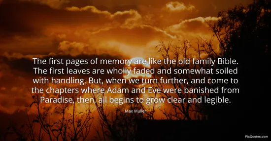 Muller, Max. "The first pages of memory are like the old family Bible. The first leaves are wholly faded and somewhat soiled with handling. But, when we turn further, and come to the chapters where Adam and Eve were banished from Paradise, then, all begins to grow clear and legible." FixQuotes. January 16, 2026. https://fixquotes.com/quotes/the-first-pages-of-memory-are-like-the-old-family-103580/.