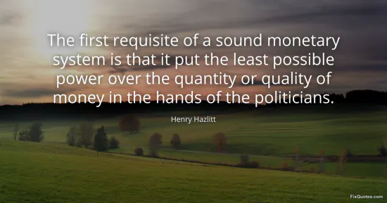 Hazlitt, Henry. "The first requisite of a sound monetary system is that it put the least possible power over the quantity or quality of money in the hands of the politicians." FixQuotes. January 15, 2026. https://fixquotes.com/quotes/the-first-requisite-of-a-sound-monetary-system-is-131852/.