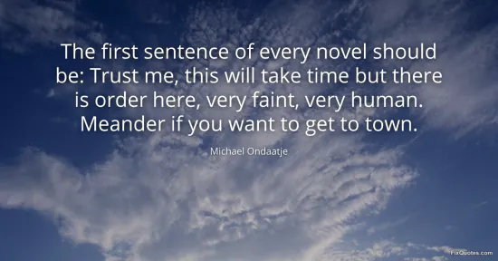 Ondaatje, Michael. "The first sentence of every novel should be: Trust me, this will take time but there is order here, very faint, very human. Meander if you want to get to town." FixQuotes. January 15, 2026. https://fixquotes.com/quotes/the-first-sentence-of-every-novel-should-be-trust-115345/.