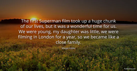 Kidder, Margot. (2026, January 17). The first Superman film took up a huge chunk of our lives, but it was a wonderful time for us. We were young, my daughter was little, we were filming in London for a year, so we became like a close family. FixQuotes. https://fixquotes.com/quotes/the-first-superman-film-took-up-a-huge-chunk-of-77868/