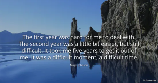 Johnson, Magic. "The first year was hard for me to deal with. The second year was a little bit easier, but still difficult. It took me five years to get it out of me. It was a difficult moment, a difficult time." FixQuotes. January 16, 2026. https://fixquotes.com/quotes/the-first-year-was-hard-for-me-to-deal-with-the-126746/.