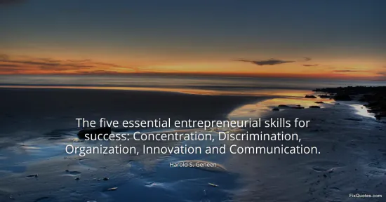 Geneen, Harold S. (2026, January 18). The five essential entrepreneurial skills for success: Concentration, Discrimination, Organization, Innovation and Communication. FixQuotes. https://fixquotes.com/quotes/the-five-essential-entrepreneurial-skills-for-12984/