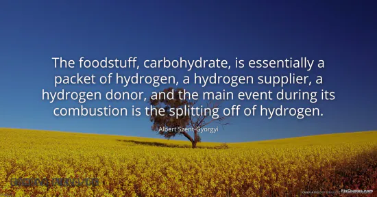 Szent-Gyorgyi, Albert. (2026, January 15). The foodstuff, carbohydrate, is essentially a packet of hydrogen, a hydrogen supplier, a hydrogen donor, and the main event during its combustion is the splitting off of hydrogen. FixQuotes. https://fixquotes.com/quotes/the-foodstuff-carbohydrate-is-essentially-a-29658/