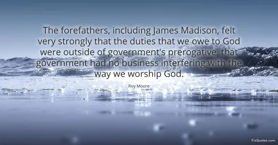 Moore, Roy. "The forefathers, including James Madison, felt very strongly that the duties that we owe to God were outside of government's prerogative, that government had no business interfering with the way we worship God." FixQuotes. January 17, 2026. https://fixquotes.com/quotes/the-forefathers-including-james-madison-felt-very-71180/.