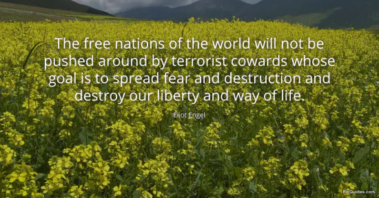Engel, Eliot. (2026, January 17). The free nations of the world will not be pushed around by terrorist cowards whose goal is to spread fear and destruction and destroy our liberty and way of life. FixQuotes. https://fixquotes.com/quotes/the-free-nations-of-the-world-will-not-be-pushed-59048/