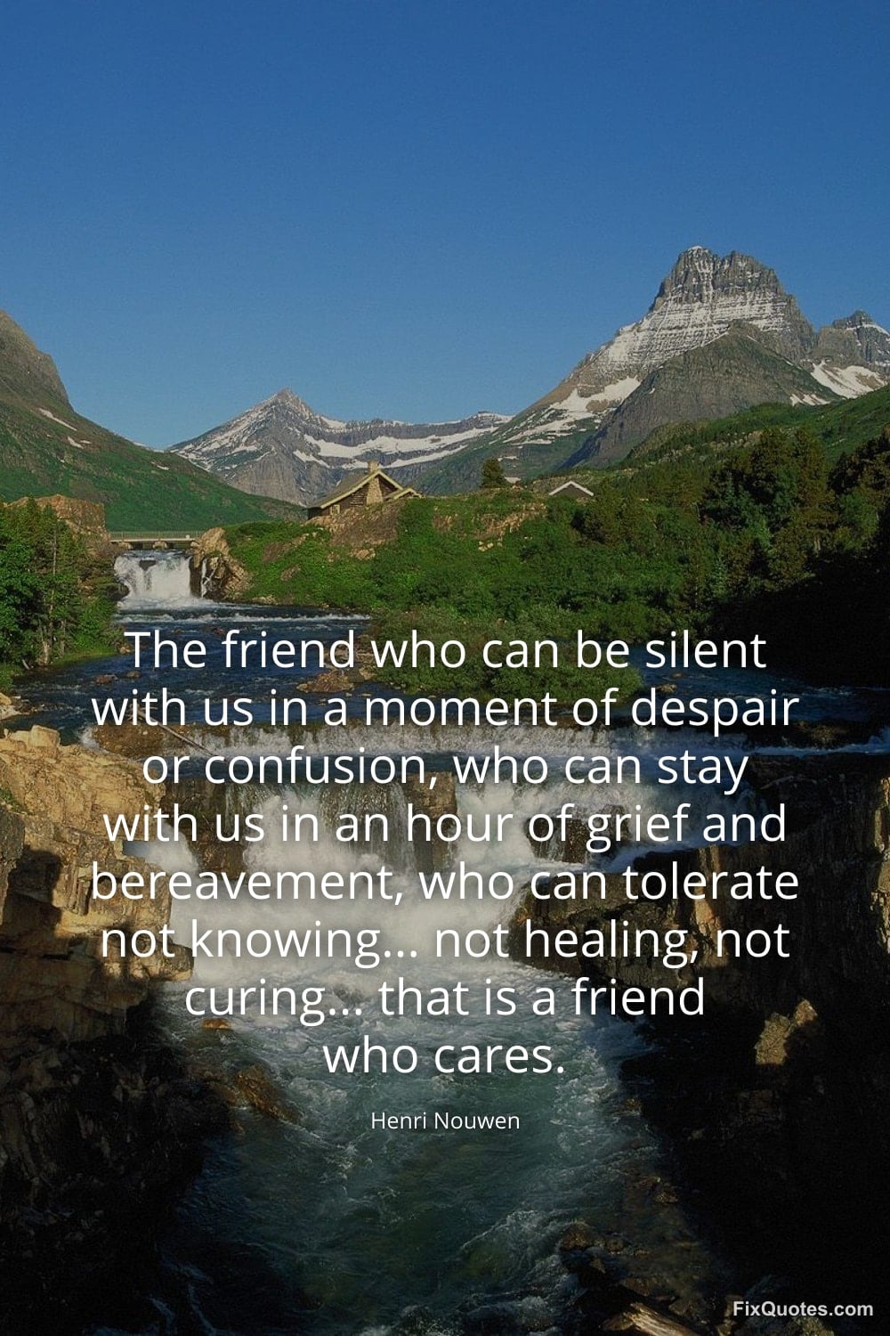Nouwen, Henri. (2026, January 17). The friend who can be silent with us in a moment of despair or confusion, who can stay with us in an hour of grief and bereavement, who can tolerate not knowing... not healing, not curing... that is a friend who cares. FixQuotes. https://fixquotes.com/quotes/the-friend-who-can-be-silent-with-us-in-a-moment-48048/
