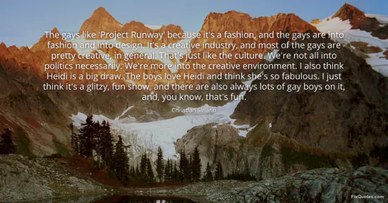 Siriano, Christian. "The gays like 'Project Runway' because it's a fashion, and the gays are into fashion and into design. It's a creative industry, and most of the gays are pretty creative, in general. That's just like the culture. We're not all into politics necessarily. We're more into the creative environment. I also think Heidi is a big draw. The boys love Heidi and think she's so fabulous. I just think it's a glitzy, fun show, and there are also always lots of gay boys on it, and, you know, that's fun." FixQuotes. January 16, 2026. https://fixquotes.com/quotes/the-gays-like-project-runway-because-its-a-139474/.