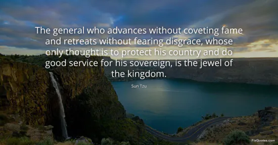 Tzu, Sun. "The general who advances without coveting fame and retreats without fearing disgrace, whose only thought is to protect his country and do good service for his sovereign, is the jewel of the kingdom." FixQuotes. January 15, 2026. https://fixquotes.com/quotes/the-general-who-advances-without-coveting-fame-33443/.