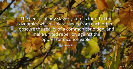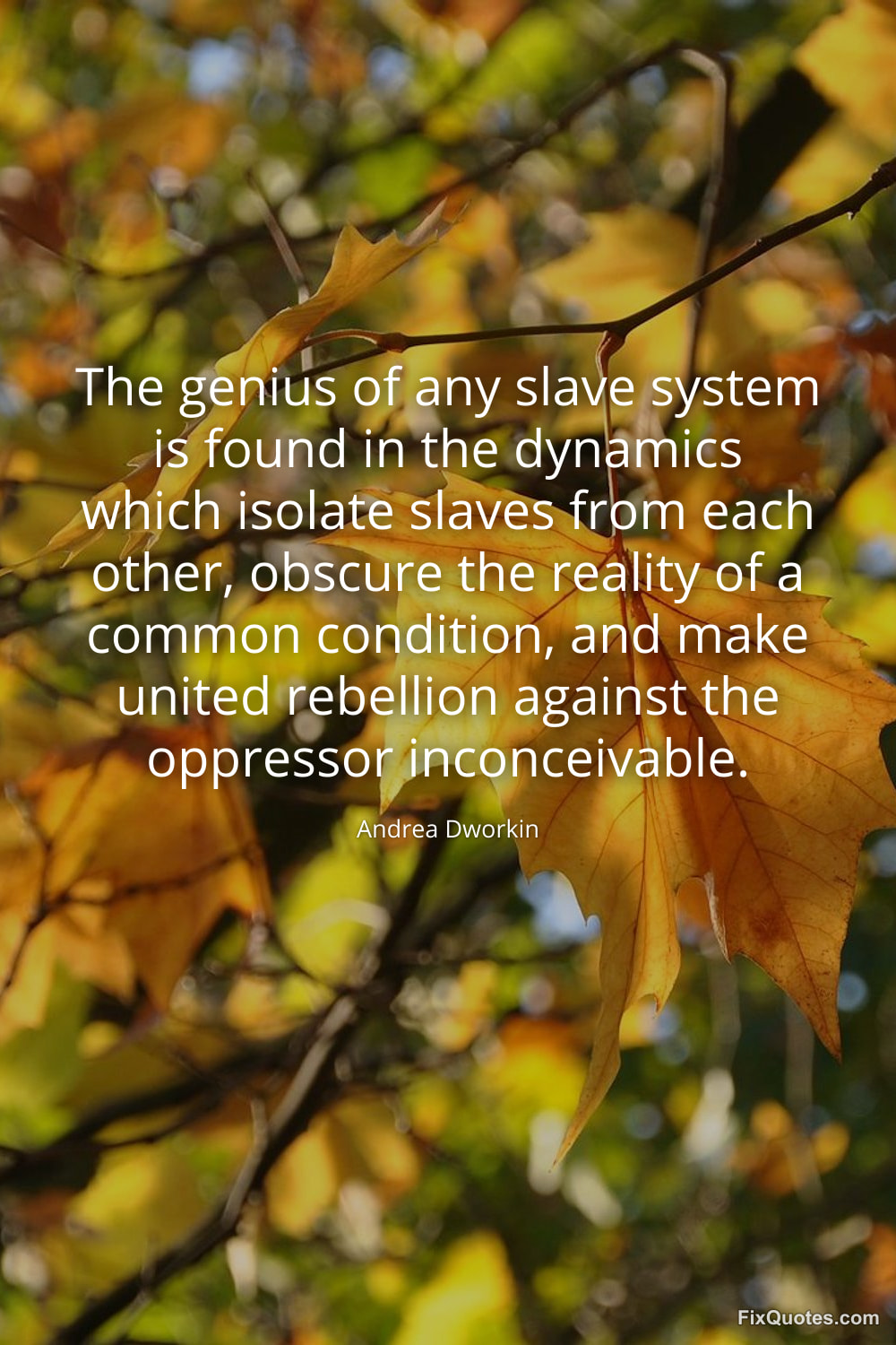 Dworkin, Andrea. (2026, January 17). The genius of any slave system is found in the dynamics which isolate slaves from each other, obscure the reality of a common condition, and make united rebellion against the oppressor inconceivable. FixQuotes. https://fixquotes.com/quotes/the-genius-of-any-slave-system-is-found-in-the-43850/