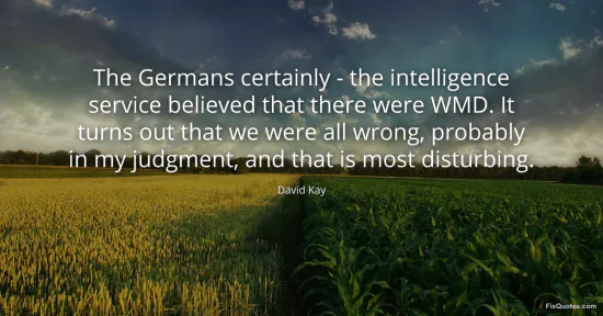 Kay, David. "The Germans certainly - the intelligence service believed that there were WMD. It turns out that we were all wrong, probably in my judgment, and that is most disturbing." FixQuotes. January 17, 2026. https://fixquotes.com/quotes/the-germans-certainly-the-intelligence-service-58262/.
