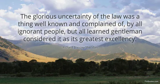 Sheridan, Richard Brinsley. "The glorious uncertainty of the law was a thing well known and complained of, by all ignorant people, but all learned gentleman considered it as its greatest excellency." FixQuotes. March 9, 2026. https://fixquotes.com/quotes/the-glorious-uncertainty-of-the-law-was-a-thing-153090/.