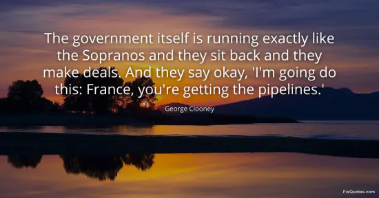 Clooney, George. (2026, January 15). The government itself is running exactly like the Sopranos and they sit back and they make deals. And they say okay, 'I'm going do this: France, you're getting the pipelines.'. FixQuotes. https://fixquotes.com/quotes/the-government-itself-is-running-exactly-like-the-148439/
