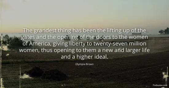 Brown, Olympia. "The grandest thing has been the lifting up of the gates and the opening of the doors to the women of America, giving liberty to twenty-seven million women, thus opening to them a new and larger life and a higher ideal." FixQuotes. January 15, 2026. https://fixquotes.com/quotes/the-grandest-thing-has-been-the-lifting-up-of-the-161620/.
