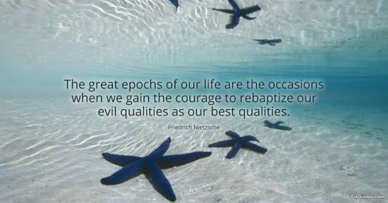 Nietzsche, Friedrich. "The great epochs of our life are the occasions when we gain the courage to rebaptize our evil qualities as our best qualities." FixQuotes. February 7, 2026. https://fixquotes.com/quotes/the-great-epochs-of-our-life-are-the-occasions-172651/.