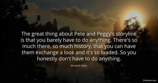 Moss, Elizabeth. "The great thing about Pete and Peggy's storyline is that you barely have to do anything. There's so much there, so much history, that you can have them exchange a look and it's so loaded. So you honestly don't have to do anything." FixQuotes. January 17, 2026. https://fixquotes.com/quotes/the-great-thing-about-pete-and-peggys-storyline-50826/.