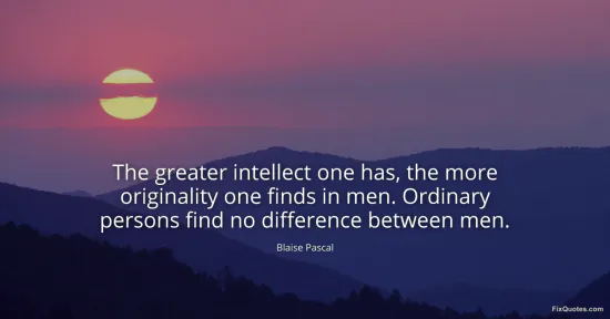 Pascal, Blaise. "The greater intellect one has, the more originality one finds in men. Ordinary persons find no difference between men." FixQuotes. January 18, 2026. https://fixquotes.com/quotes/the-greater-intellect-one-has-the-more-5081/.